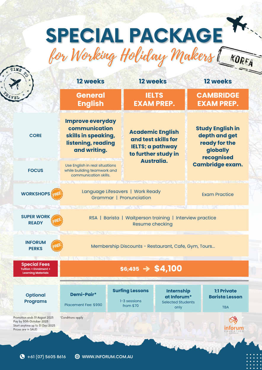 Super Work Ready (Premium Job Skills Program) | 학업장소: 골드코스트 (INFORUM 캠퍼스) 학업기간: 2주 (총 4일) 학비: AUD $605 (12주 어학연수 등록시 무료) 학력조건: 고교 졸업 이상 영어조건: Pre-Intermediate 이상 입학시기: 2주마다 개강 비자조건: 워킹홀리데이 또는 학생비자 학과링크: https://inforum.com.au/wp-content/uploads/2024/08/Inforum-Super-Work-Ready.pdf |