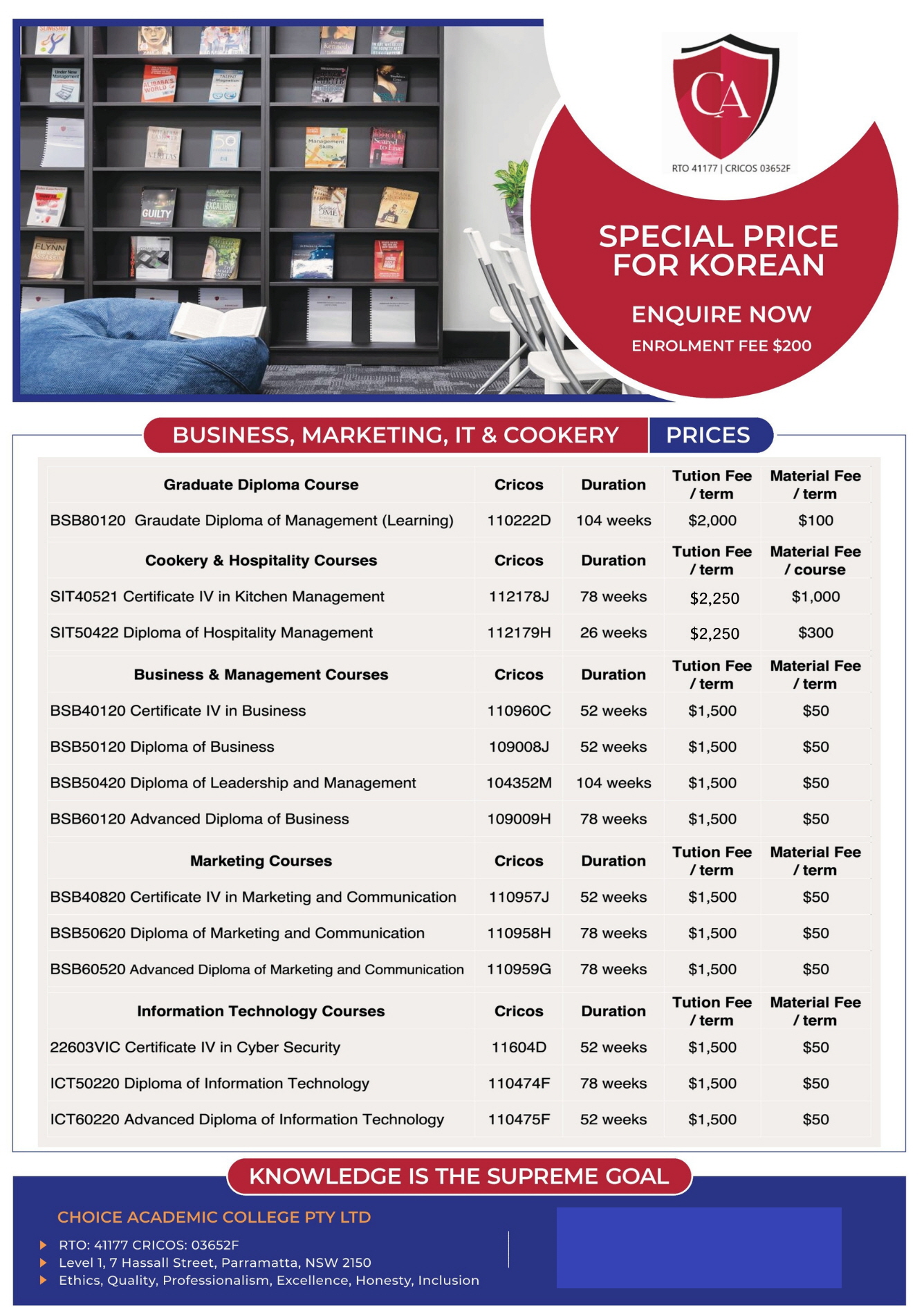 CAC 컬리지는 호주 뉴사우스웨일즈주 파라마타(Parramatta)에 위치한 직업교육기관으로, 국제학생을 위한 실무 중심 교육 과정을 제공하는 Registered Training Organisation (RTO)입니다. 또한 해외 유학생을 교육할 수 있는 CRICOS 등록 교육기관으로 인정되어 있습니다.