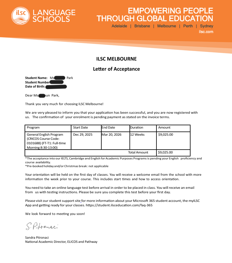 2025년 7월 30일자로 박O은님의 입학허가서 발행이 되었습니다.