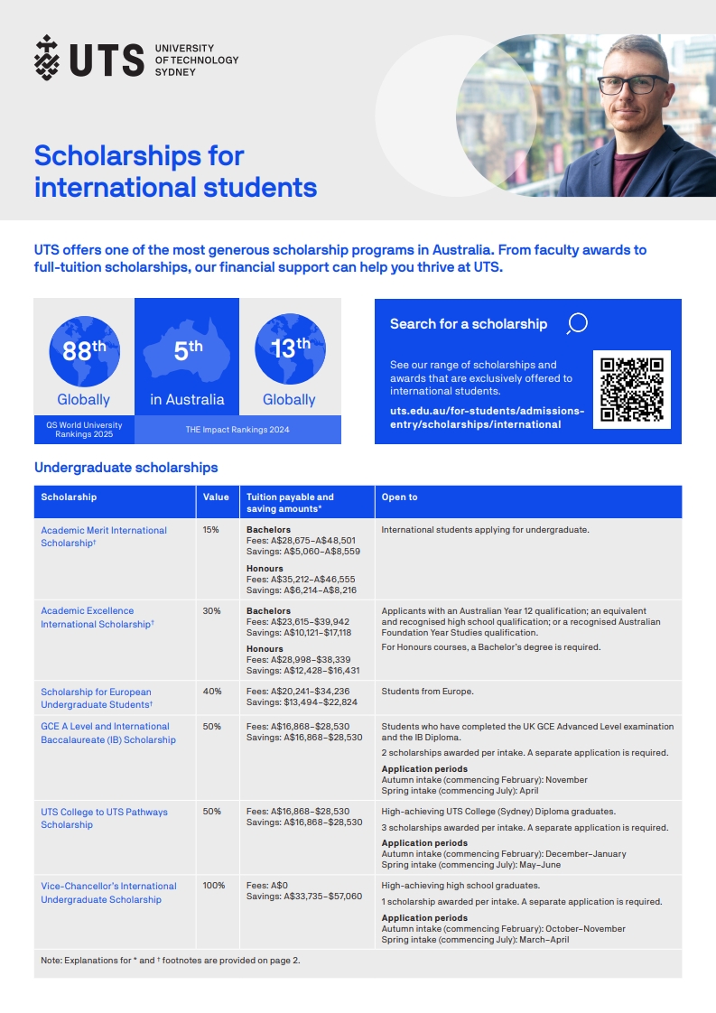 | UTS College to UTS Pathways Scholarship | 학비 50% 감면 (연간 A$16,868~28,530 절감) | UTS College 디플로마 졸업 후 진학 시 매 인테이크 3명 선발 /별도 신청 필요 |