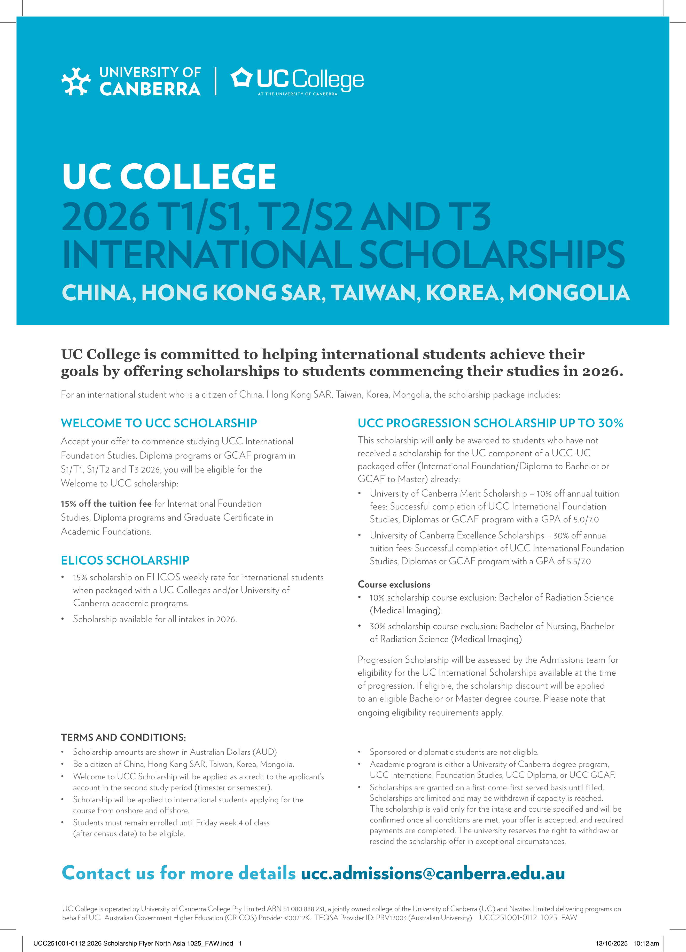 √ UC College 또는 University of Canberra 전공 과정과 ELICOS 과정 패키지 등록 시 적용